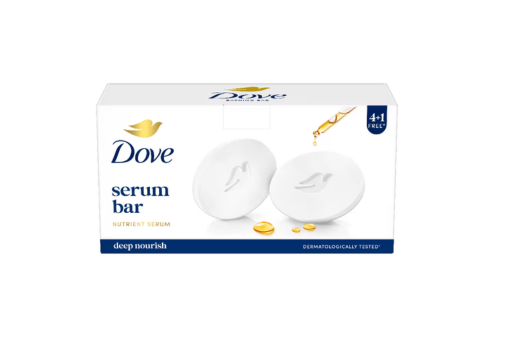 Dove Serum Bar 4+1 Pack 125g includes five nourishing bars enriched with nutrient serum. It gently cleanses, moisturizes deeply, and keeps skin soft, smooth, and hydrated after every bath.