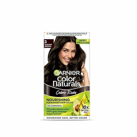 Garnier Color Naturals 3 Darkest Brown Hair Color delivers rich, intense darkest brown color with long-lasting results. Its nourishing formula helps cover greys while leaving hair soft, smooth, shiny,