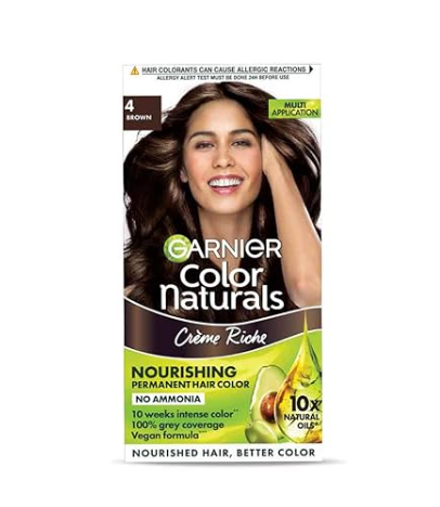 Garnier Color Naturals Crème Rich 4 Brown Hair Color delivers rich brown color with long-lasting shine. Its nourishing crème formula helps cover greys while leaving hair soft, smooth, silky, and natur