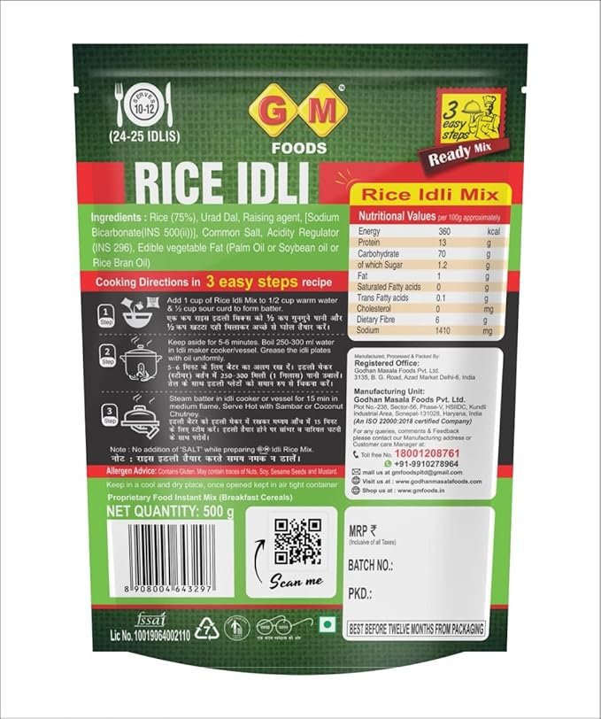 GM Foods Rice Idli Flour Mix is a ready-to-use flour blend for making soft and fluffy idlis easily at home. It delivers authentic South Indian taste and perfect texture for a quick and nutritious meal