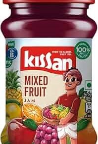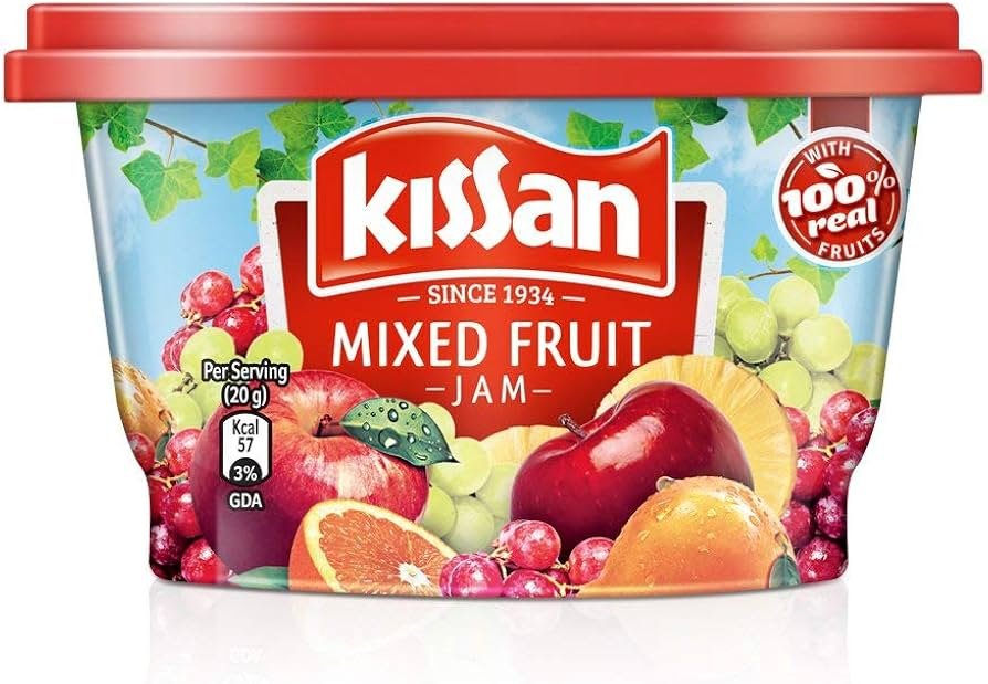 Kissan Mixed Fruit Jam 95g is a delicious blend of real fruit pulp, perfect for spreading on bread, roti, or paratha for a sweet and fruity breakfast treat.