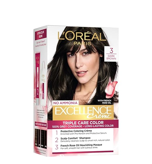 L’Oréal Excellence Crème Triple Care Color 3 Dark Brown is a permanent hair dye that delivers rich dark brown color with deep nourishment. It offers triple-care protection—strengthening, conditioning,
