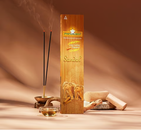 Mangaldeep Sandal Incense Sticks spread the soothing fragrance of sandalwood, perfect for daily पूजा, meditation, and relaxation. Creates a calm, spiritual atmosphere at home with long-lasting aroma and premium quality incense sticks.
