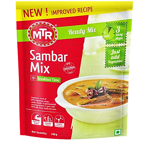 MTR Sambar Mix 180g helps you prepare authentic South Indian sambar easily. Just add vegetables and water rich, flavorful, and perfect with rice or idli/dosa.