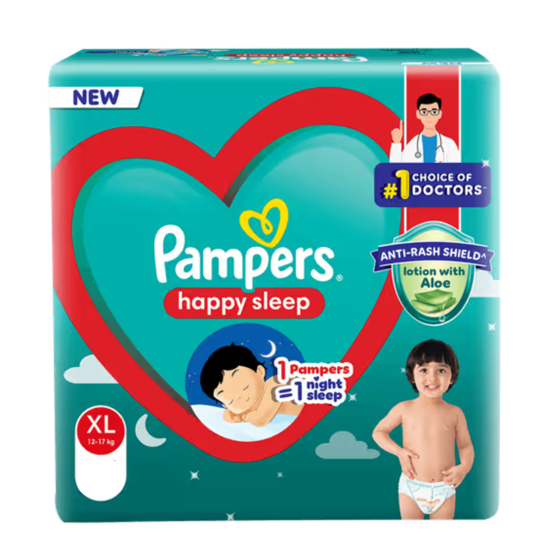 Pampers Happy Sleep XXL diapers offer soft comfort, high absorbency, and overnight leak protection. Designed for bigger babies, they help keep skin dry and comfortable for a peaceful night’s sleep.