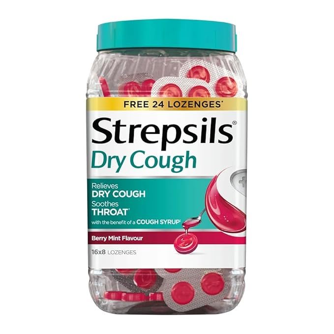 Strepsils Dry Cough lozenges provide soothing relief from dry cough and throat irritation, helping to calm discomfort while freshening the throat for lasting comfort.